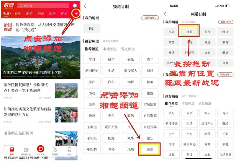 打开时刻新闻APP→点击右上角“+”→在频道列表中选择“湘超”→长按拖动至靠前位置