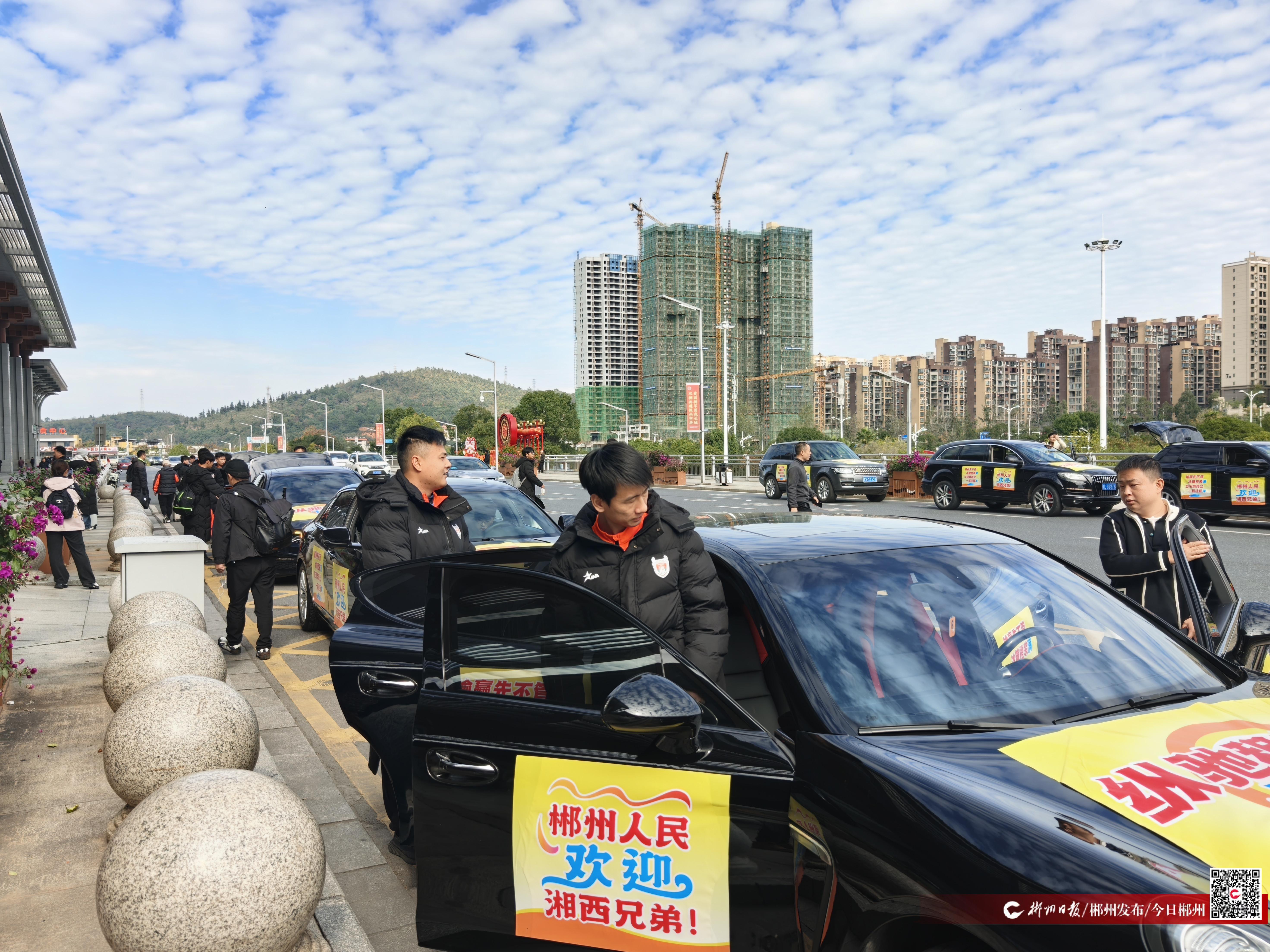 “郴州人民欢迎湘西兄弟!”“输赢先不管。冰糖橙装满;吃碗烧鸡公,一起往前冲!”在郴州西站,郴州球迷组织20台豪车迎接湘西队的到来。当湘西队的身影出现在出站口,郴州球迷齐声高呼欢迎口号。湘西队的教练员和队员被这份热情深深感染,脸上露出了惊喜与感动的笑容。他们纷纷向球迷们挥手致意,表达着对郴州球迷的感激之情。随后,湘西队全体成员有序上车,在球迷的陪伴下前往下榻酒店。