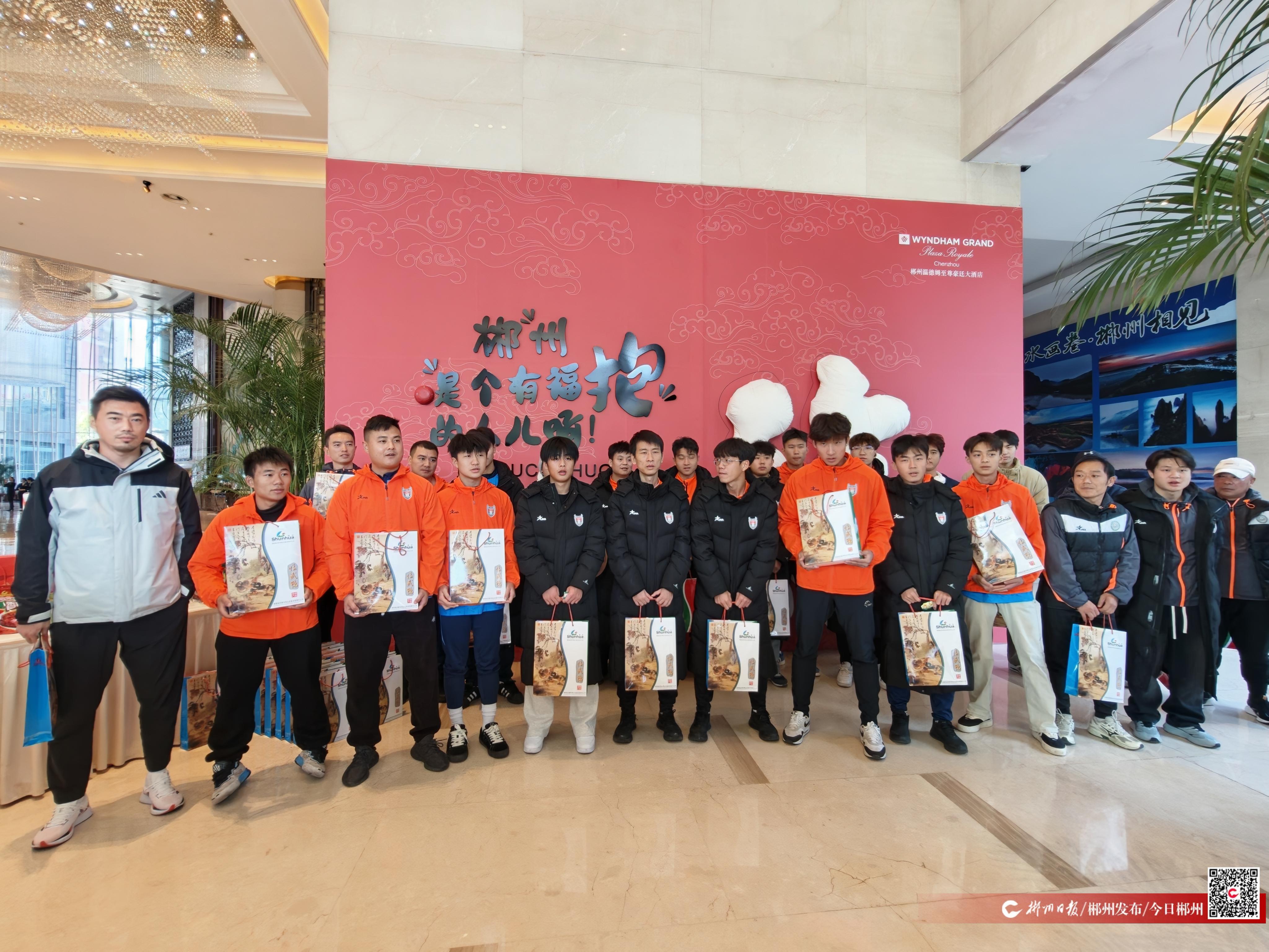 在酒店,郴州赛区冠名商舜华鸭业公司举行了简短的欢迎仪式,向远道而来的客队成员赠送伴手礼,并送上温情祝福。