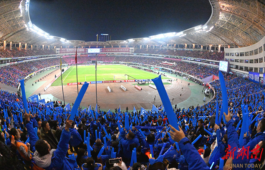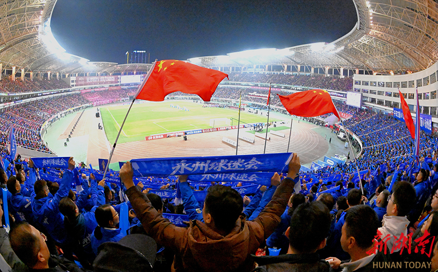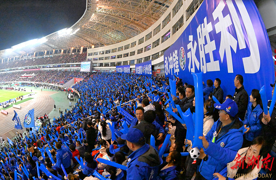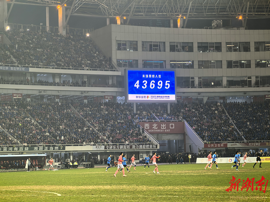 12月27日晚,下半场比赛火热进行中,贺龙体育场现场观赛人数有43695人。当晚,2025湖南省足球联赛决赛在长沙贺龙体育场打响,永州队(蓝)与常德队展开终极较量。 湖南日报全媒体记者 辜鹏博 摄