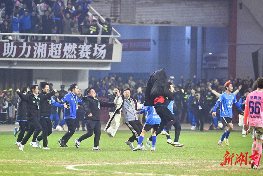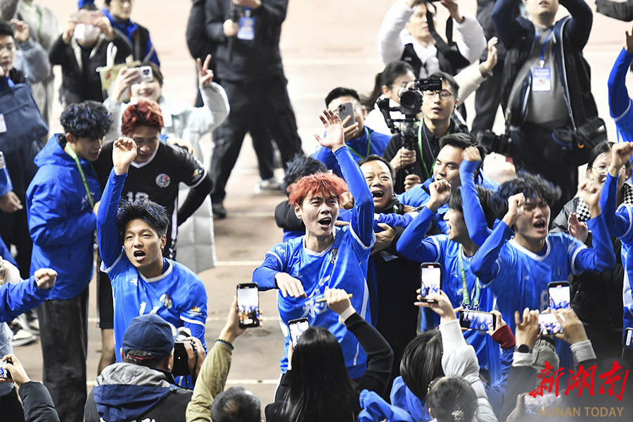 湘超联赛,湖南足球联赛,湘超赛程,湘超直播,湘超积分榜,湘超球队/湘超联赛为湖南足球迷提供最新赛程、实时比分、积分榜排名、球队信息和直播入口,掌握最新赛事动态,畅享足球激情。12月27日晚,夺冠后,永州队球员和教练在领奖台上捧起奖杯,欢呼庆祝。当晚,2025湖南省足球联赛决赛在长沙贺龙体育场打响,永州队(蓝)与常德队展开终极较量,最终永州队以1:0战胜常德队。 湖南日报全媒体记者 辜鹏博 摄