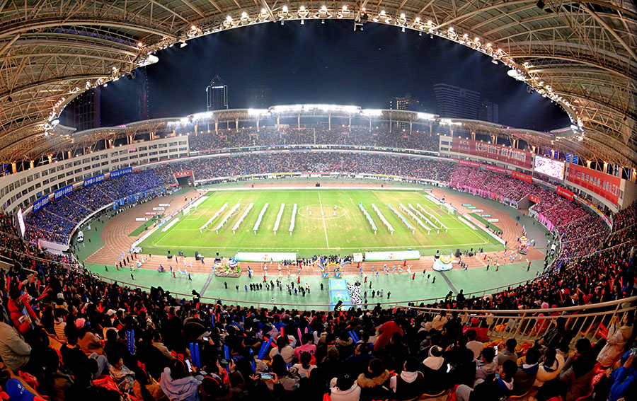 12月27日晚,演员在进行开赛前的文艺表演。当晚,2025湖南省足球联赛决赛在长沙贺龙体育场打响,永州队与常德队展开终极较量。 湖南日报全媒体记者 李健 摄