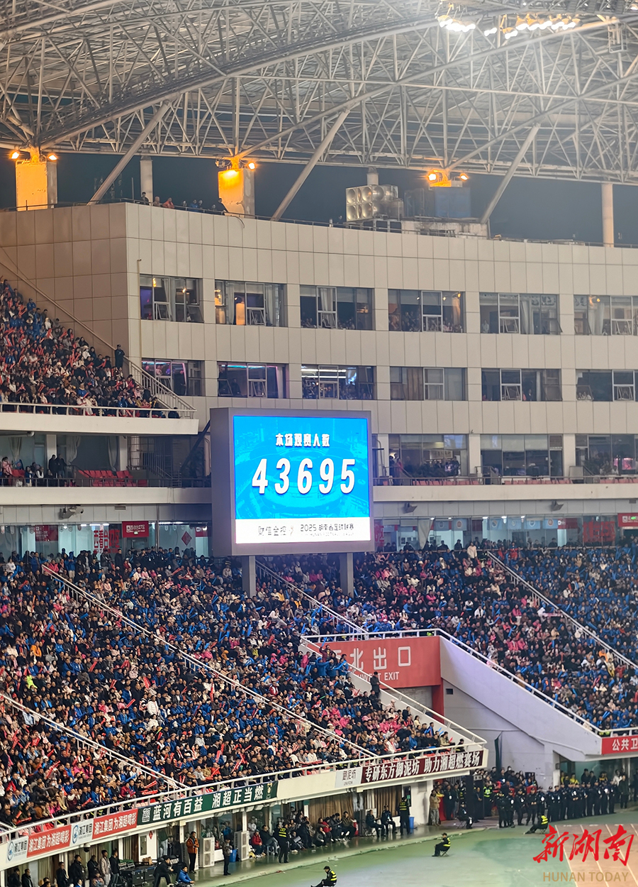 12月27日晚,下半场比赛火热进行中,贺龙体育场现场观赛人数有43695人。当晚,2025湖南省足球联赛决赛在长沙贺龙体育场打响,永州队(蓝)与常德队展开终极较量。 湖南日报全媒体记者 郭立亮 摄