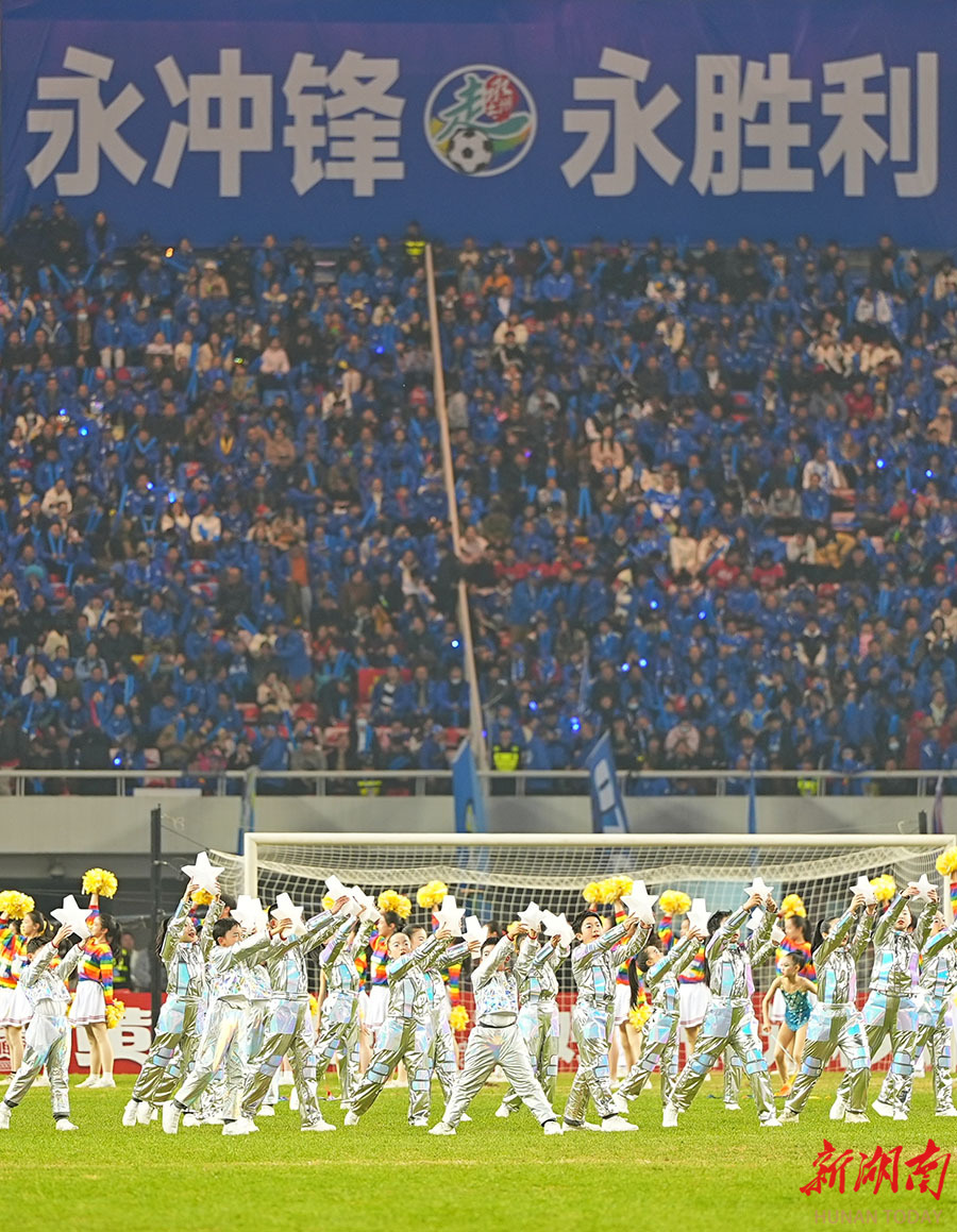 12月27日晚,演员在进行开赛前的文艺表演。当晚,2025湖南省足球联赛决赛在长沙贺龙体育场打响,永州队与常德队展开终极较量。 湖南日报全媒体记者 辜鹏博 摄