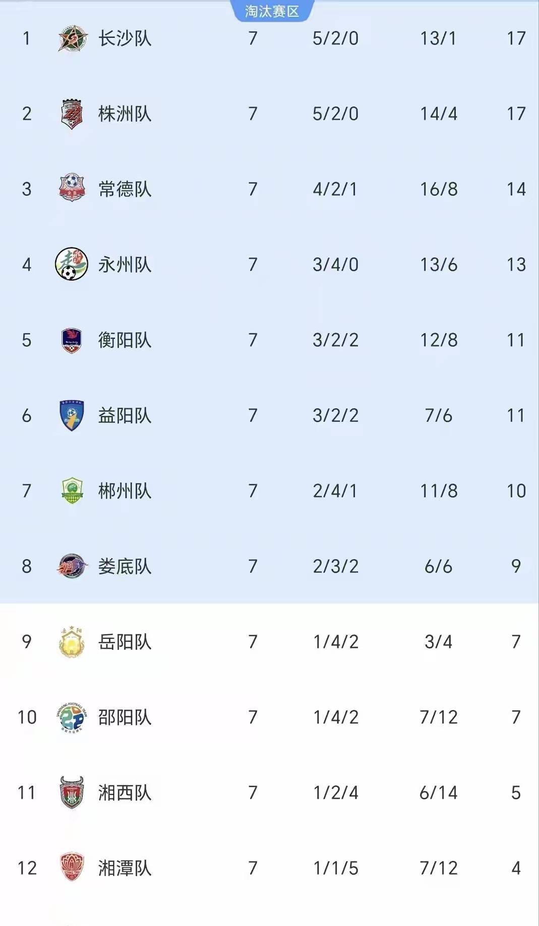 榜尾方面,怀化队七轮仅积1分惨遭垫底,湘潭队则在客场3-0大胜怀化后迎来赛季首胜,摆脱了积分榜末位的位置。