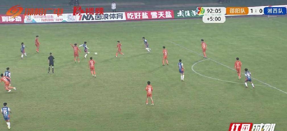 还有邵阳队和湘西队的比赛,就有点沉闷。比赛一开始,两队就在防守和进攻上僵持,上半场攻防节奏很零散,双方都没找到好的进球机会。下半场比赛气氛好了点,但比分一直没变,直到快结束时僵局才被打破。邵阳队的孙利俊雄抓住对方防线空当,精准射门,球进了湘西队球门。这是全场唯一进球,邵阳队靠这场小胜拿到了关键三分。