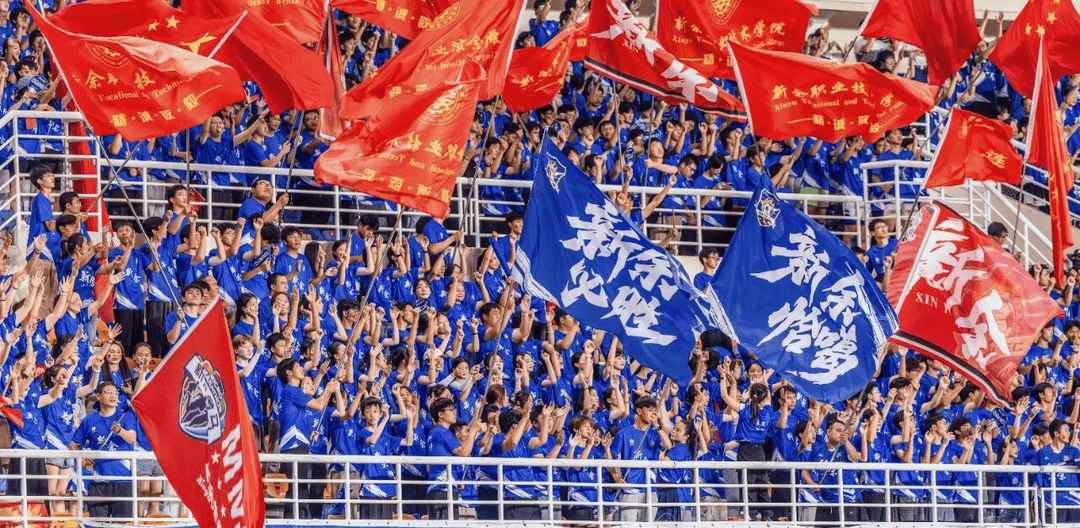 2025年赣超现场,蓝衣球迷旗帜招展,看台上红蓝交织,助威热情点燃全场。
