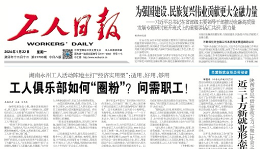 11月19日,湖南工人报以《永州创新“工会+湘超”模式,“工力量”助攻“永冲锋”》为题,头版头条推介我市工会消费券激活文旅市场经验做法。