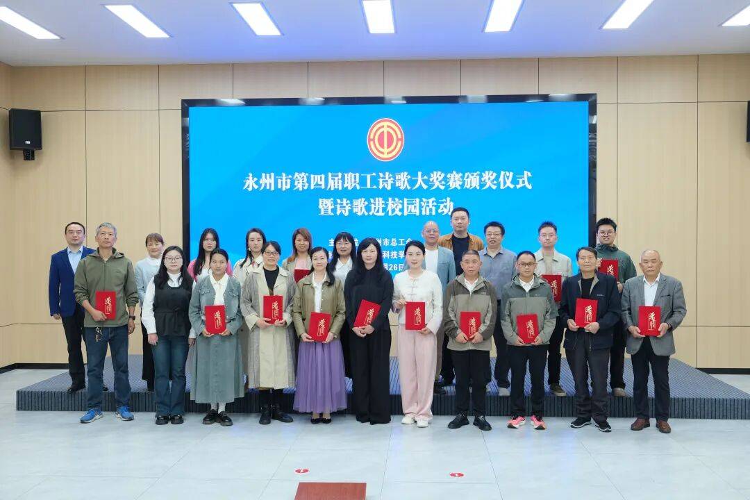 4月26日,永州市第四届职工诗歌大奖赛颁奖仪式暨诗歌进校园活动在湖南科技学院举行。市人大常委会副主任、市总工会主席李天明,市总工会党组书记、副主席乐家茂,湖南科技学院文法学院院长谷显明,市总工会党组成员、副主席廖予,《湖南文学》编辑部主任易清华,《芙蓉》杂志编辑部主任杨晓澜,永州市作家协会主席吴茂盛出席颁奖仪式并为获奖作者颁奖。活动还为与会人员赠送书籍《空城纪》、《触碰与回响》,邀请《芙蓉》杂志编辑部主任杨晓澜,以《AI背景下诗歌的坚守与突围》为题,分享了诗歌创作体会和刊物选稿用稿要求。