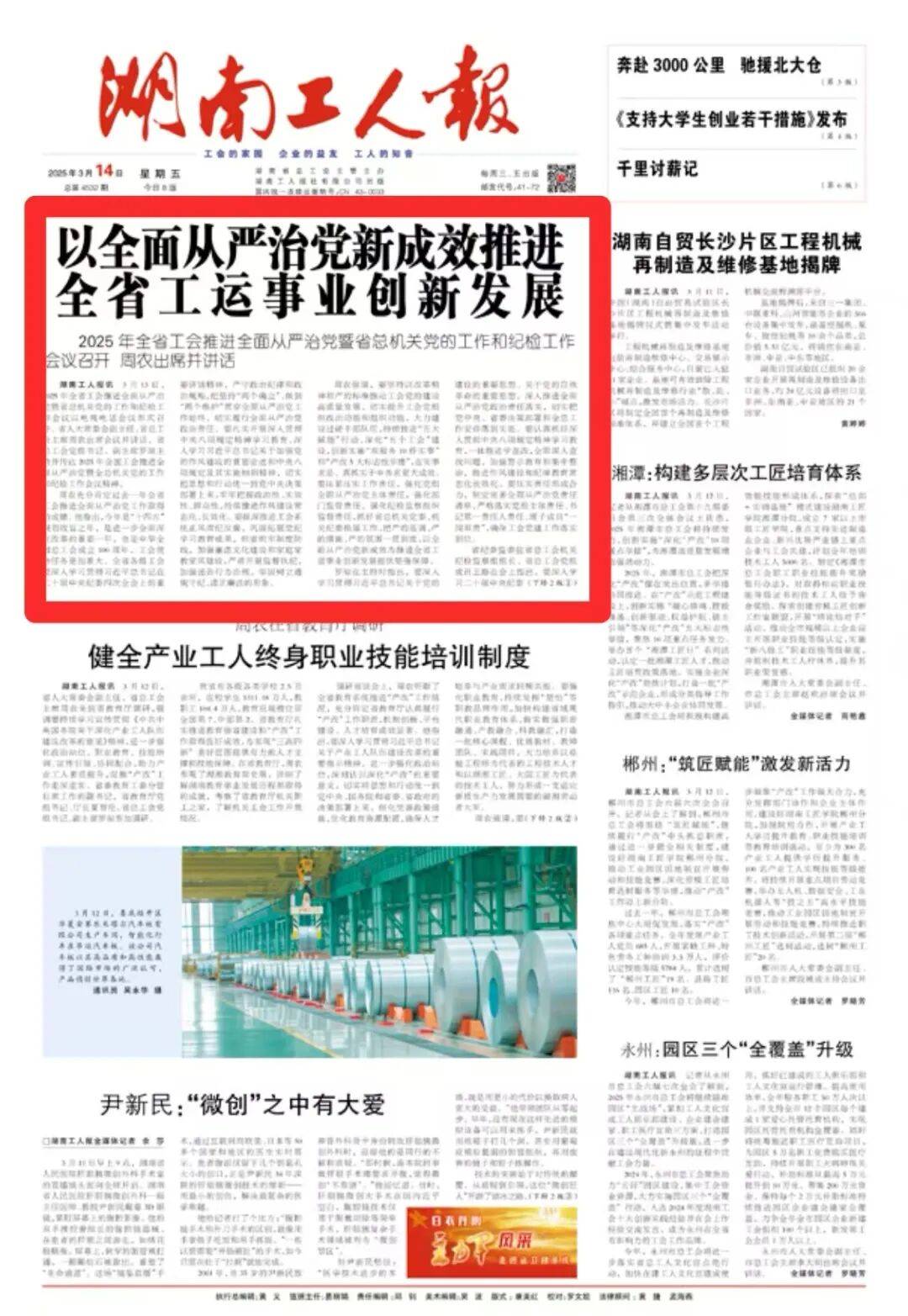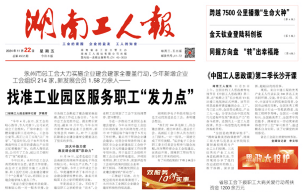 湖南工人报头版头条推介永州市建体系、搭平台,激励产业工人成长成才,全力打造园区“产改”新样板