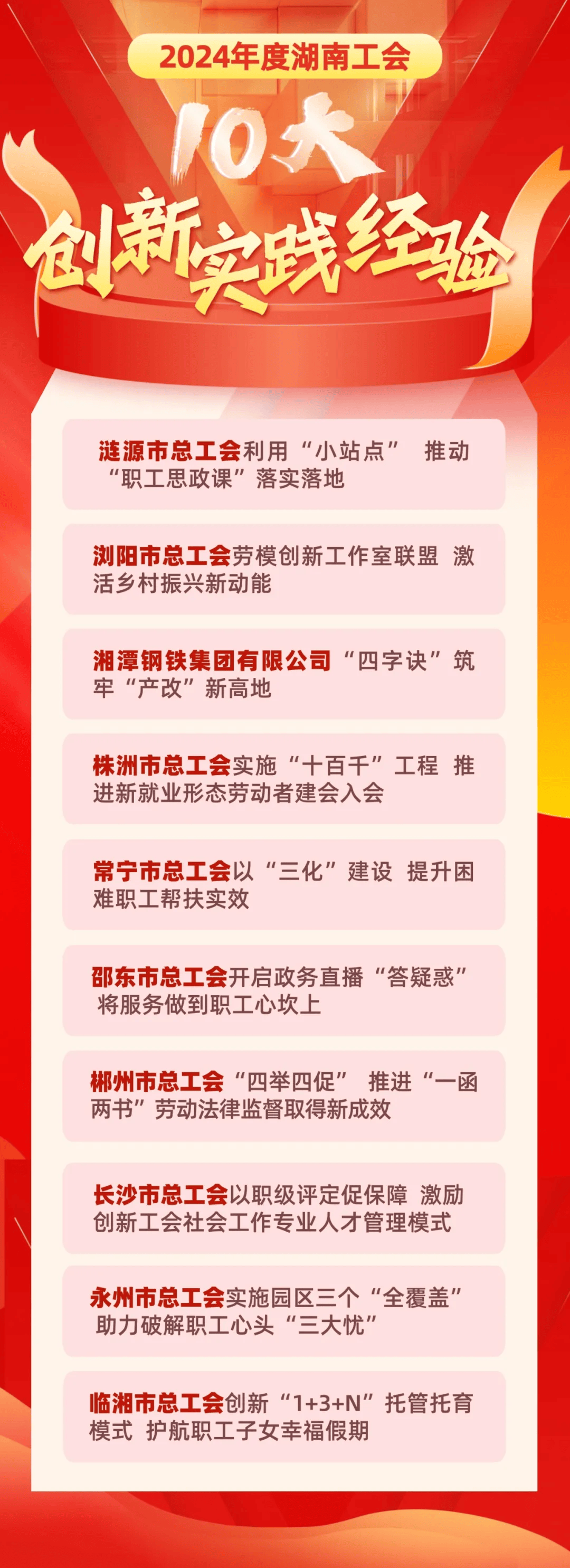 2月10日,2024年度湖南工会10大创新实践经验在长沙发布,《永州市总工会实施园区三个“全覆盖”助力破解职工心头“三大忧”》榜上有名。此次入选的10大创新实践经验是由湖南省总工会围绕 15个方面的工会重点工作,从全总、省总发布的创新案例以及省总创新案例库中遴选而来,充分展现了湖南各级工会在推动创新发展方面的积极探索和显著成效。