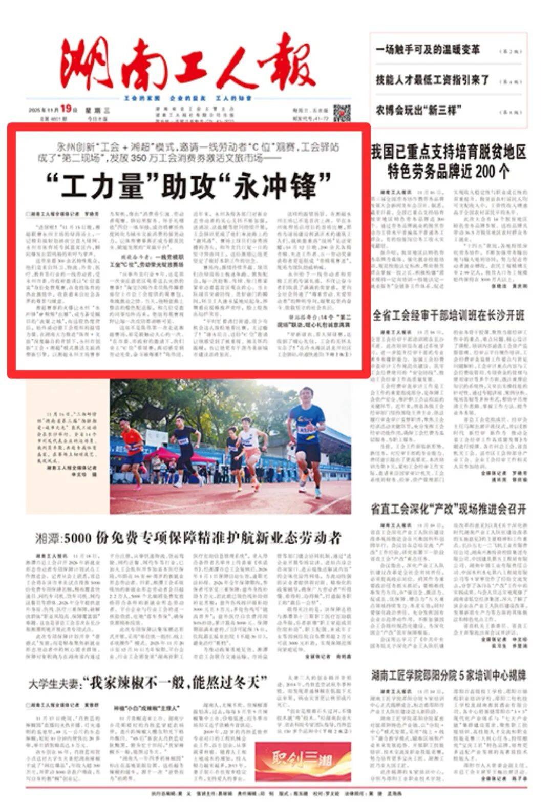 湖南工人报头版头条推介永州创新“工会+湘超”模式,“工力量”助攻“永冲锋