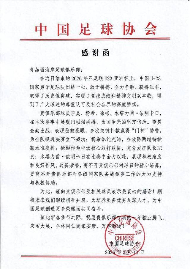 中国足协的感谢函里写得明明白白:U23亚洲杯上,中国队能拿下亚军,西海岸的四名球员立了大功。门将李昊场场首发,高接低挡堪称“移动长城”;杨希跑动距离全队前三,攻防两端拼到抽筋;队长徐彬中场调度如大脑,连对手教练都夸他“踢得像老将”;木塔力甫·依明卡日哪怕替补上场,每次冲刺都让对手头皮发麻。
